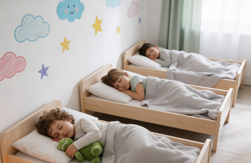 Okul öncesi eğitimde gün boyu devam eden öğrenme süreci, çocukların zihinsel ve fiziksel enerjilerini hızla tüketir. Çocuk Koleji, bu enerjinin yeniden toplanması ve sabah kazanılan bilgilerin kalıcı hafızaya aktarılması için “öğle uykusu” dilimini kritik bir gelişim evresi olarak planlar. Uyku odalarımız, çocukların gece uykusuna geçişi değil, günün ikinci yarısına zinde ve dengeli bir başlangıç yapmalarını sağlayan kısa süreli bir “yenilenme merkezi” olarak tasarlanmıştır.